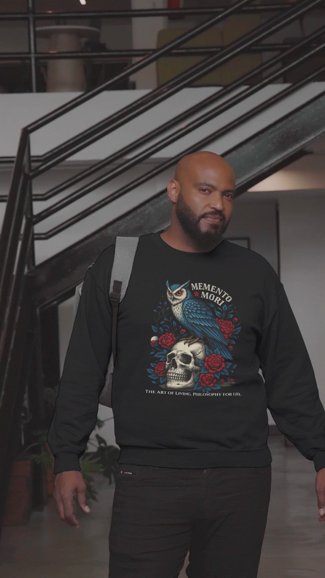 cozy crewneck brings dark-romantic style to everyday wear. A midnight-black sweatshirt features a richly detailed print: a watchful owl perched above a weathered skull, framed by deep red roses and subtle foliage. The phrase “Memento Mori” arches above the scene, while a small motto beneath—“The art of living. Philosophy for life.”—adds thoughtful contrast. The medium-heavy fabric and classic fit create a comfortable, lived-in feel that layers easily over tees or under coats. Wear it when you want clothing that feels like a whispered reminder to live fully and intentionally.